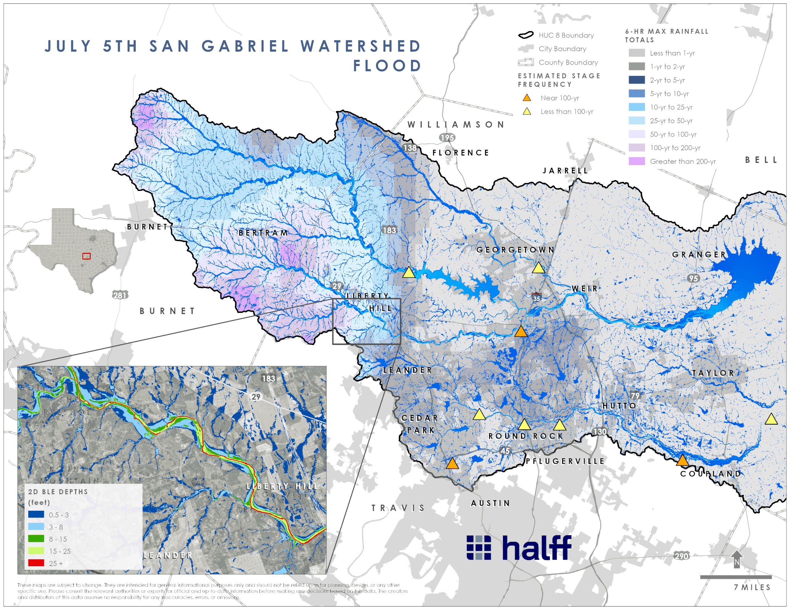 The upstream portion of the San Gabriel watershed, especially in the Bertram and Liberty Hill areas, experienced rainfall amounts consistent with 100-year to greater than 200-year return period events, depending on rainfall duration (ranging from three-hour to 24-hour intervals). Swift water rescues near 6 a.m. on July 5 at the Burnet and Williamson County boundary suggests a short-duration, high-intensity rainfall triggered this event.