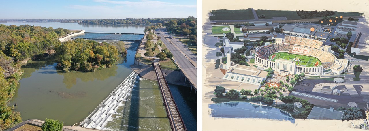 White Rock Lake and Dam spillway (left) and renderings of the Cotton Bowl at Fair Park.
